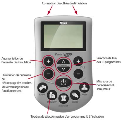![]() | Funzioni del DIRECT TENS• Selezione dei programmi facilitata dalla semplice pressione sulla rappresentazione anatomica associata alla regione dolorosa, • Blocco automatico della tastiera dopo 10 secondi di utilizzo, • Indicatore di carica, • Timer regolabile : 1-59 min o illimitato (automatico) Programmi del DIRECT TENSLo stimolatore DIRECT TENS offre 13 programmi preregistrati dedicati alla cura del dolore. Tra questi: • TENS Gate Control (effetto analgesico) agente al livello del midollo spinale per fermare le fitte di dolore e impedire loro di arrivare fino al cervello, • Burst/Endorfinico, stimolante i muscoli affinché liberino delle sostanze endogene (endorfine) che calmino il dolore, • Tens Alta Frequenza, efficace soprattutto per trattare dei dolori acuti e cronici. • programmi di Tens Mista, Tens Modulata o in associazione con differenti trattamenti TENS. |